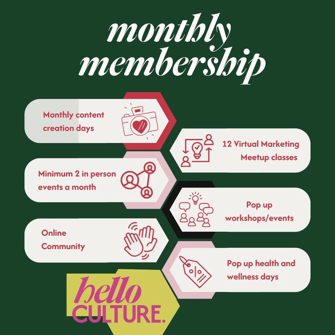 At Hello Culture, we support each other through mentorship, collaboration, and accountability. Whether you're new to business or a seasoned pro, let’s chat about how this community could support your vision.